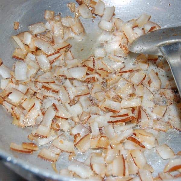 STEP 2: Heat oil in a pan and fry the coconut pieces until they turn golden brown. Keep it aside.
