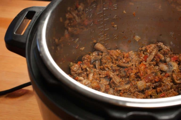 - Add ground beef and mix well. Mushrooms have a ton of water in them, which seeps out while cooking. Cook until the mushrooms and ground beef have released their liquids and has evaporated. It would take about 10-15 minutes. When it starts sticking to the bottom of the Instant Pot, change the Instant Pot setting to SAUTE mode NORMAL setting.