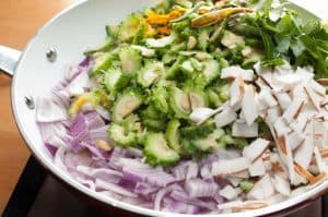 - Heat 2 tablespoon oil in a pan. Then add onion, bitter gourd, coconut pieces, green chilli, curry leaves, turmeric powder, and salt. Adding the onions and coconut pieces helps reduce the bitterness, so never compromise on it.