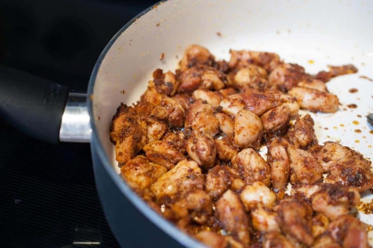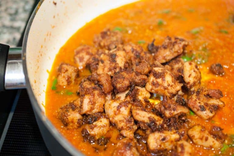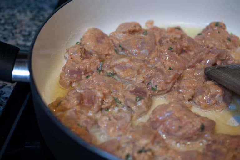 - Shallow fry the chicken - Heat 2 tablespoon butter in a large, thick-bottomed skillet and put in the chicken with the marinade. Cook on medium high heat. The marinade is liquidy. Let the water evaporate and then brown the chicken. Turn the chicken over during cooking. Keep the cooked chicken aside.