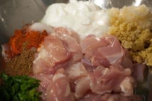 - Prepare Butter chicken marinade - Mix ingredients listed under marination - lemon juice, yogurt, ginger paste, garlic paste, chilli powder, cumin powder, garam masala and fenugreek leaves. Marinate the chicken well. Keep it for 2 - 3 hours minimum or overnight for best results.