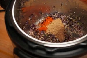 - Add the ginger, garlic paste. Saute well till the aromatics release their flavor. Continue in the SAUTE mode LOW setting.