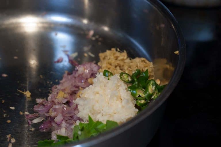 Shallots, ginger, garlic, green chilli, tomato, salt, and coconut oil. Exact quantities and nutritional details are given in the recipe card below.