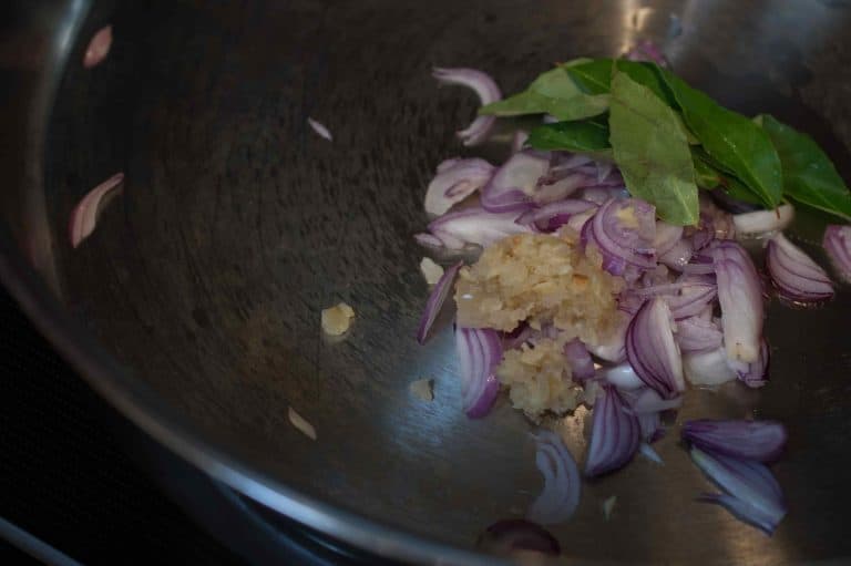 - Slice shallots. Grind/Crush the ginger into a fine paste. Heat oil in a pan. Saute shallots, ginger and curry leaves until shallots are brownish in color.