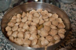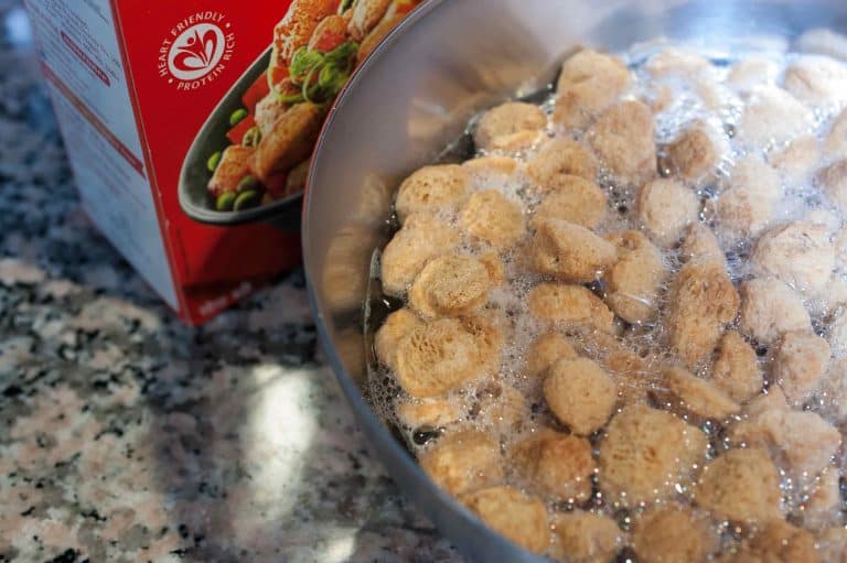• Place the soya chunks in a bowl and fill it up with enough hot boiling water so that the soya chunks are completely immersed. Close the bowl with a lid. Leave it aside for 20 minutes.
